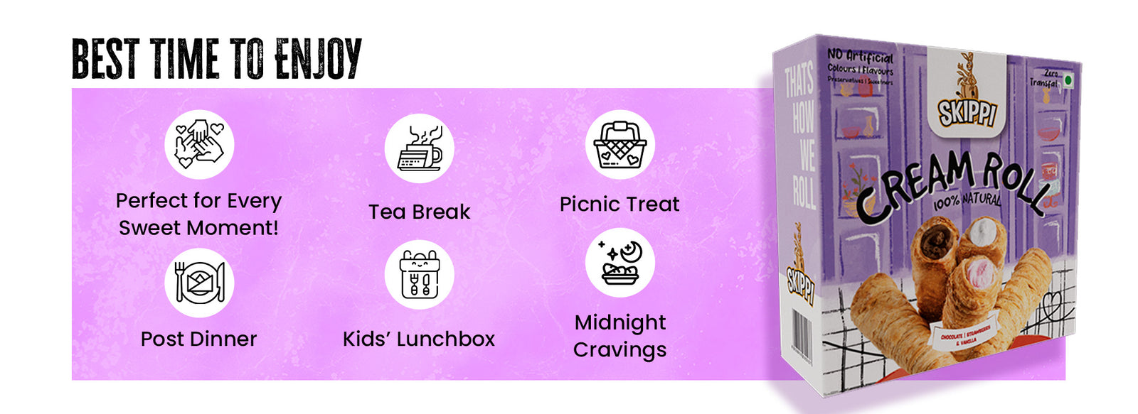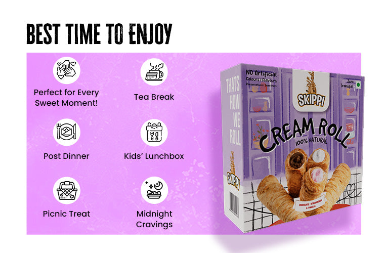 Cream Rolls Skippi,delightful assorted box of 6 rolls(180gm) 2 Vanilla,2 Chocolate & 2 Strawberry Flavor, Pack of 1